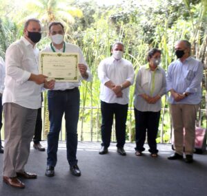 O governador Paulo Câmara foi homenageado, na manhã desta segunda-feira (20.09), durante cerimônia comemorativa dos 130 anos de funcionamento da Usina Cucaú, localizada no município de Rio Formoso, na Mata Sul do Estado. O governador foi agraciado com uma medalha e diploma referentes à celebração, no evento que reuniu representantes do setor político, empresarial e jurídico e também marcou o início do período de moagem de cana da safra 2021/2022.
